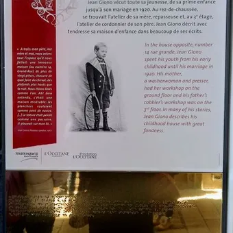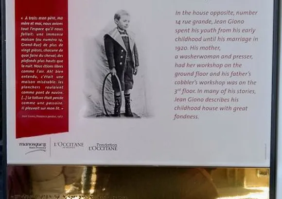 Une plaque indique que l'écrivain Jean Giono est né dans cette maison en mars 1895. Il vécut toute son enfance et sa jeunesse dans la maison en face du numéro 14 de la rue Grande.